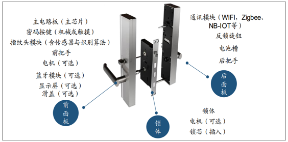 從物理結(jié)構(gòu)上,智能門鎖通??梢苑譃槿糠郑呵懊姘濉㈡i體、后面板;主要零部件包括鎖體、指紋頭(或密碼按鍵)、主電路板、通信模塊等。